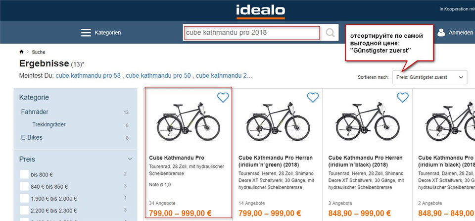 Наш совет: если Вы не знаете или еще не выбрали конкретную модель велосипеда и хотите только прицениться, укажите в поисковой строке: fahrrad